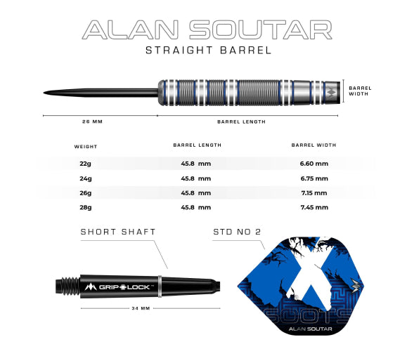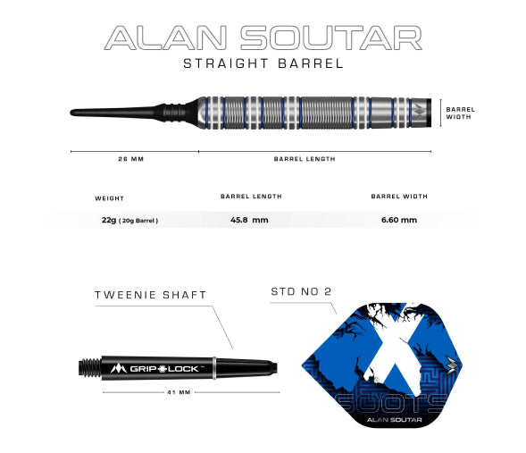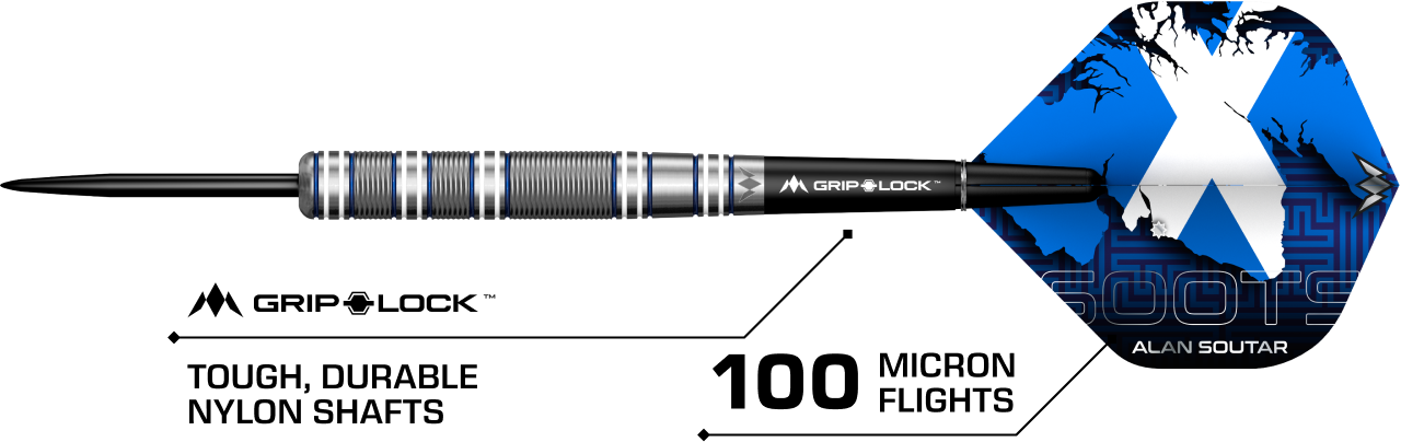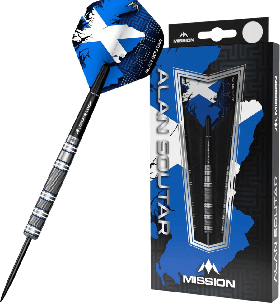 The Mission Alan Soutar player darts feature a straight barrel design and bull nose with a striking Blue and White Electro plate coating. The full length of the barrel has a mixture of radial grooves and micro-cuts between those grooves, enhancing the grip. The flights display Alan’s Scottish heritage and mark the town of Arbroath.