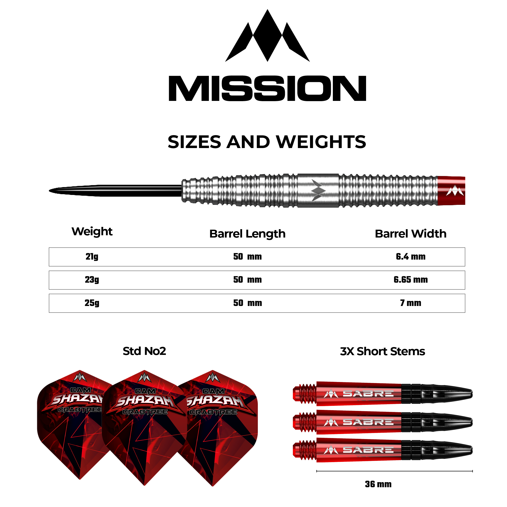 The barrel leads to a Mission Sabre shaft in red with a black top which keeps the flight in place. The dart is complete with a black point and the Mission logo is laser-etched into the rear of the barrel.