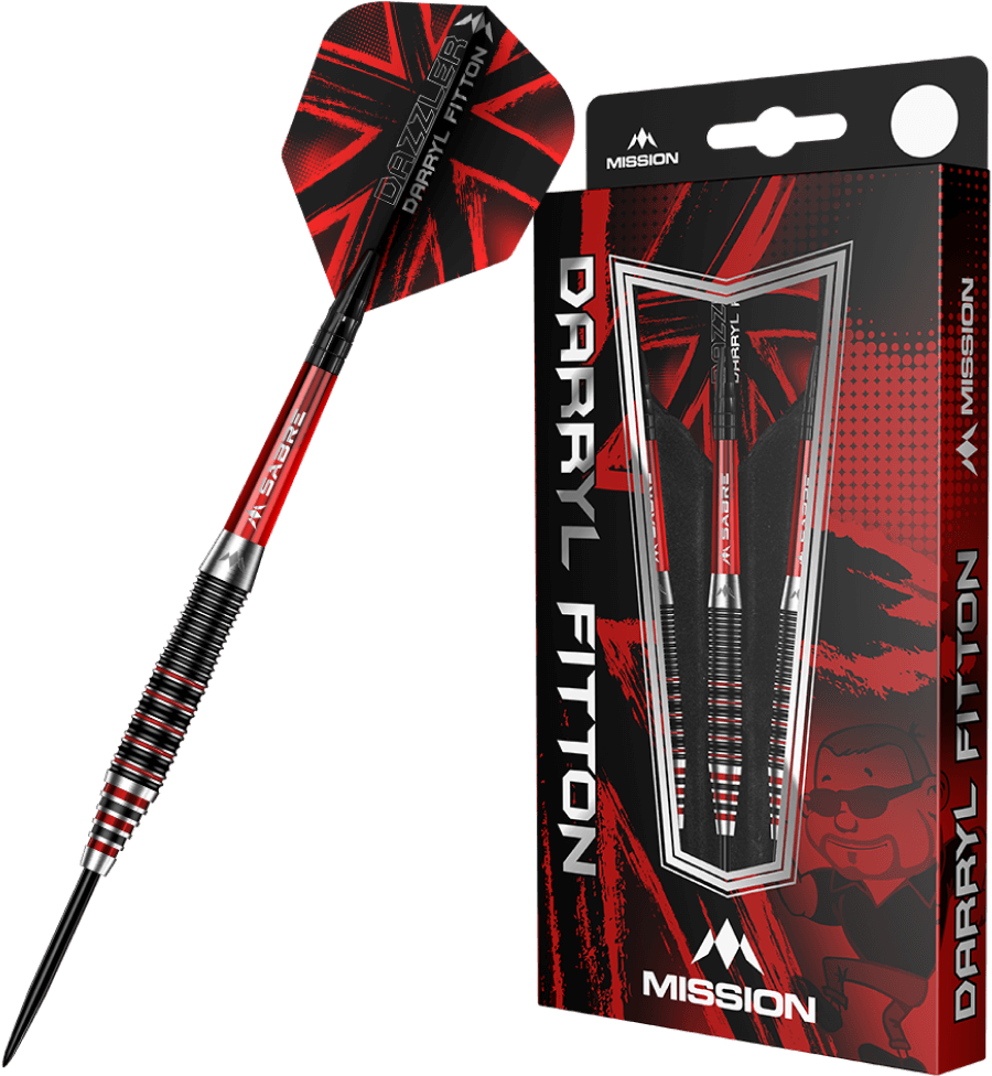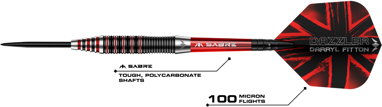 During production the barrel undergoes both black and red electroplating, providing a sharp contrast to the dazzling Tungsten that’s exposed by precision re-machining. The red and black theme continues into the transparent red body and black aluminium top of the Sabre shaft, which tightly grips the red and black Darryl Fitton signature flight.