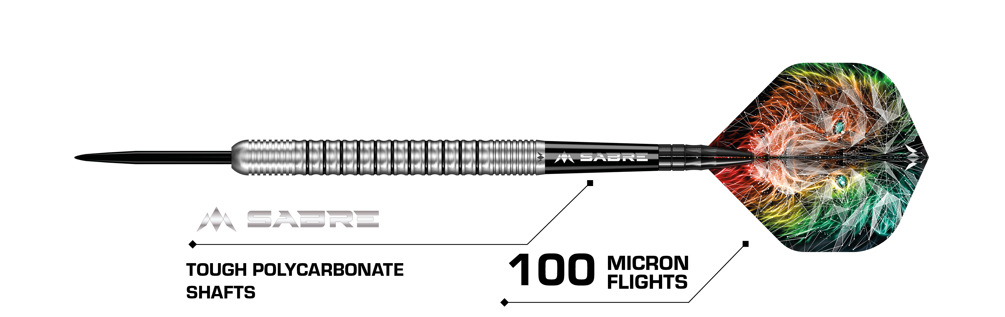 Be a fierce competitor on the oche with these Dominik Gruellich Darts. The young German has established himself as one of their brightest prospects after a series of impressive runs on the PDC Development Tour. Gruellich’s first set of Mission darts feature 95% tungsten barrels with a bull nose design. The ringed grip straight barrel design includes a mixture of radial grooves along the length of the barrel, which are highlighted by black painted rings. The barrel leads to a Mission Sabre shaft in black which keeps the flight in place. The dart is complete with a black point and the Mission logo is laser-etched into the rear of the barrel.