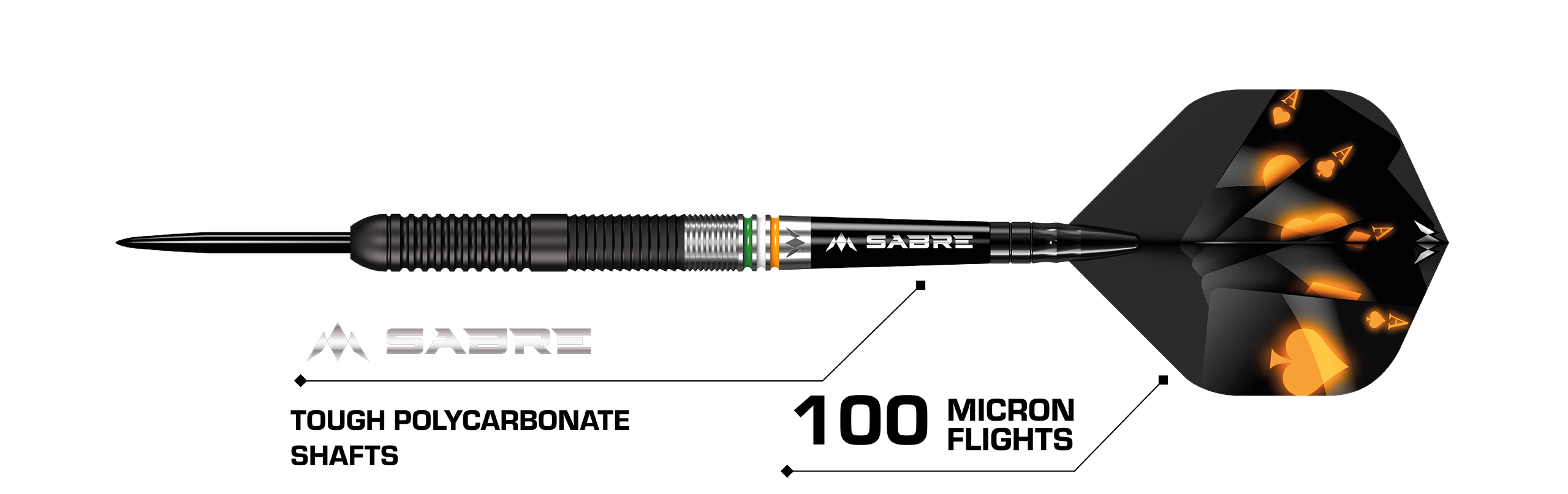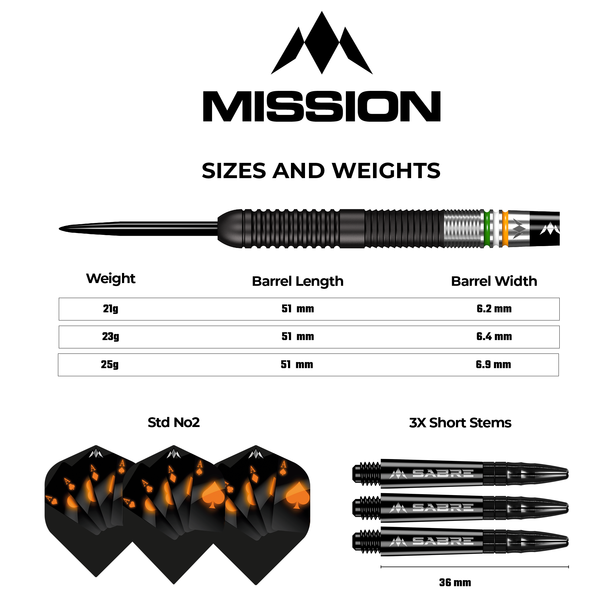 The barrel leads to a Mission Sabre shaft in black which keeps the flight firmly in place. The dart is complete with a black point and the Mission logo is laser-etched into the rear of the barrel.
