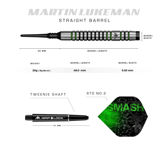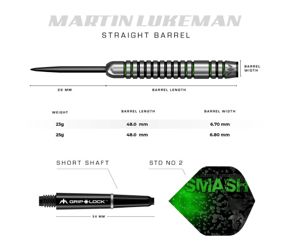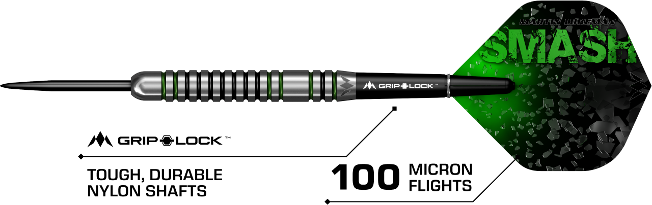 The Mission Martin Lukeman player darts feature a straight barrel design and cut in Radius nose. The full length of the barrel has uniformed Radial grooves with vivid Green and Black Electro plate coating to pack a punch!