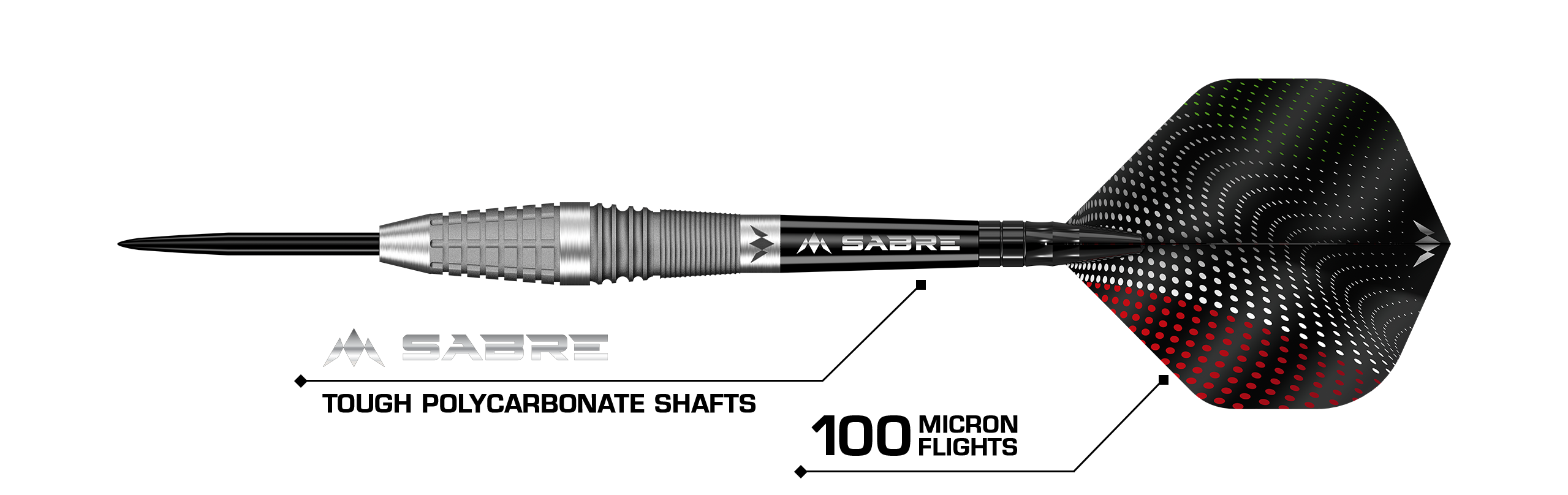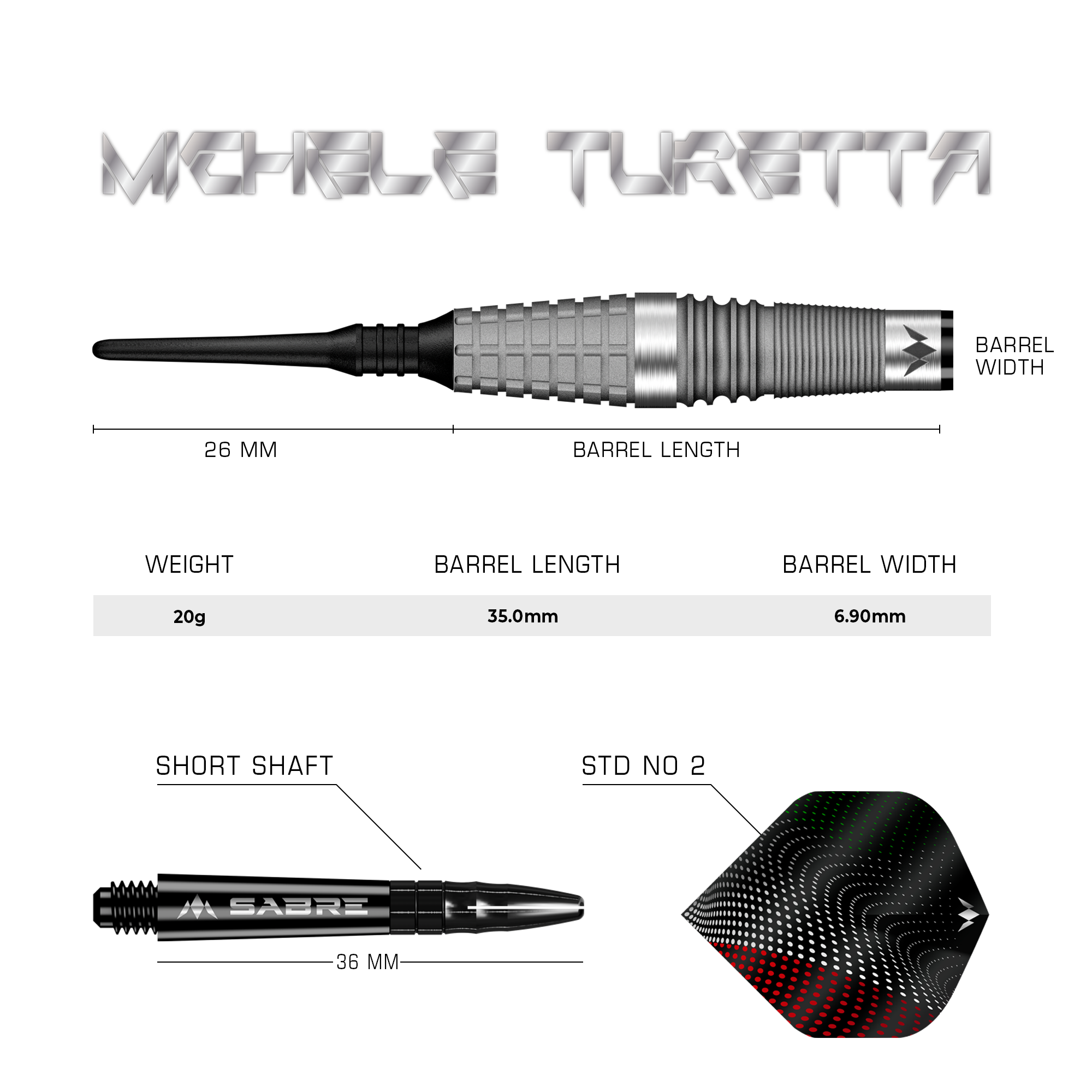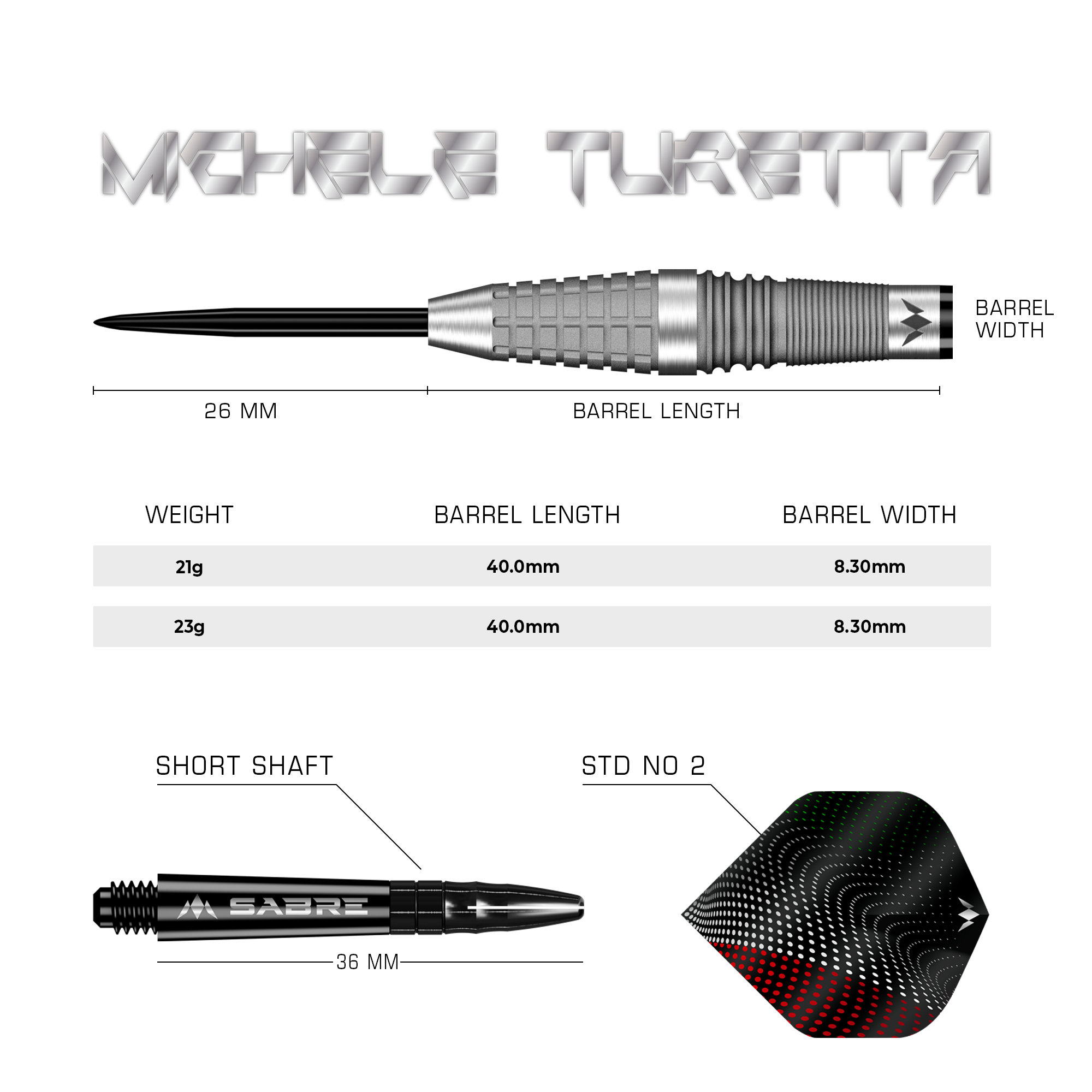 The front of the dart tapers to a black point, whilst the rear of the dart leads to a black Mission sabre shaft with a black top and Turetta’s own signature Mission flights. Available in steel tip and soft tip.