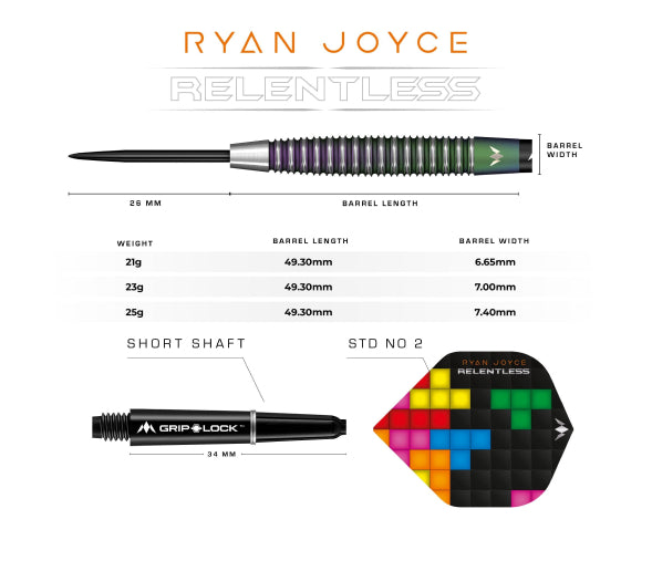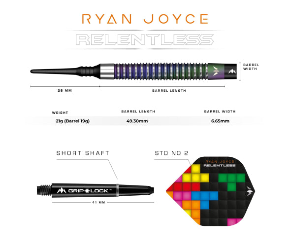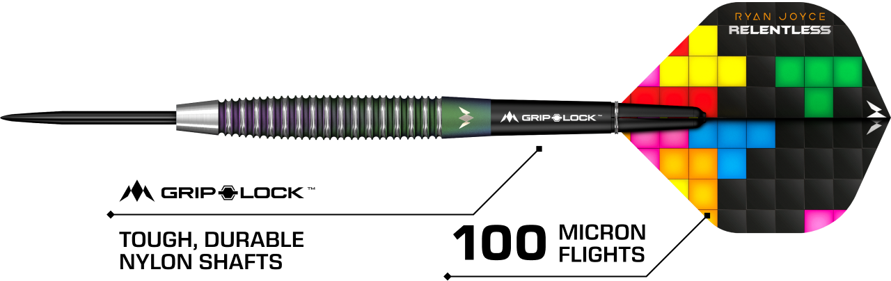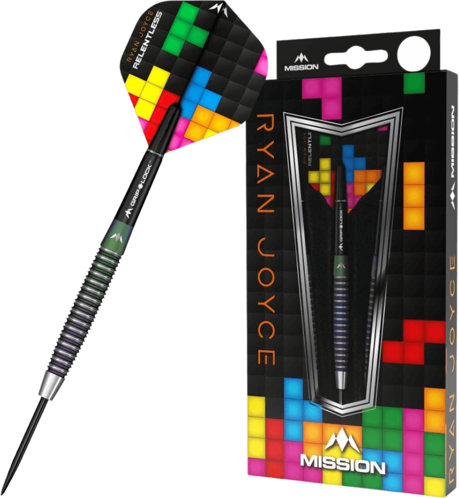 The Mission Ryan Joyce player darts feature a torpedo barrel design and tapered nose, radial grooves and finished with a Coral PVD coating that gives a spectrum of colours, completed by the Mission logo laser etched into the rear of the barrel. These 95% Tungsten 'Relentless' darts are inspired by retro-gaming, but give you the latest design and production methods so it's soon going to be GAME OVER for your competitors! We've given these a grip rating of 6 out of 10.